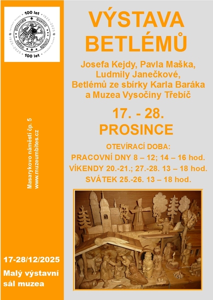 Městské muzeum ve Velké Bíteši vás zve na vánoční výstavu, která se uskuteční od 17. do 28. prosince v Malém výstavním sále muzea. Vedle Velkobítešského Betlému pana Kejdy, který si pro svou sbírku nechalo muzeum vyhotovit na zakázku, budete mít možnost shlédnout pohyblivý Betlém pana Maška, zapůjčeny budou rovněž dvě ukázky Třebíčské řezbářské práce Betlémů z Muzea Vysočiny Třebíč. Práce řezbářů budou doplněny o Bítešský patrový Betlém paní Janečkové a také o ukázky Betlémů vyhotovených z různorodých materiálů ze sbírky pana Karla Baráka z Újezdu u Rosic.
